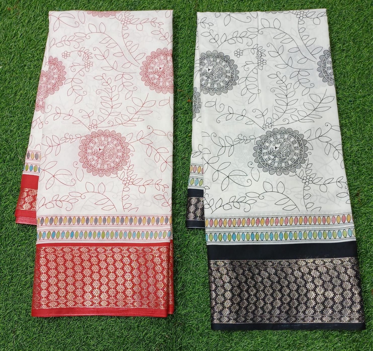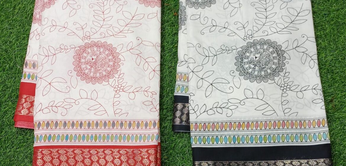 Our sarees are designed using premium Dolla Silk, known for its lightweight drape, rich texture, and soft touch. Paired with graceful red borders and intricate white prints, these sarees bring out the perfect Bengali festive essence.
