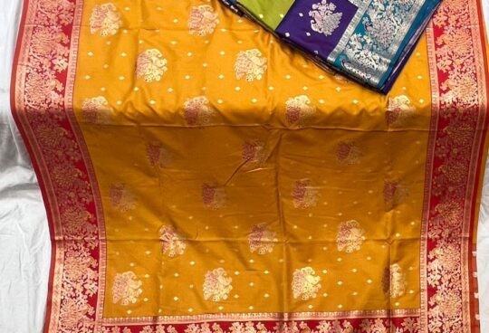 This collection features beautiful yellow sarees with elegant flower prints, crafted using first-quality fabric for comfort and durability. Each saree comes with a matching blouse piece and is ideal for temple events, religious gatherings, kirtans, and devotional programs.
