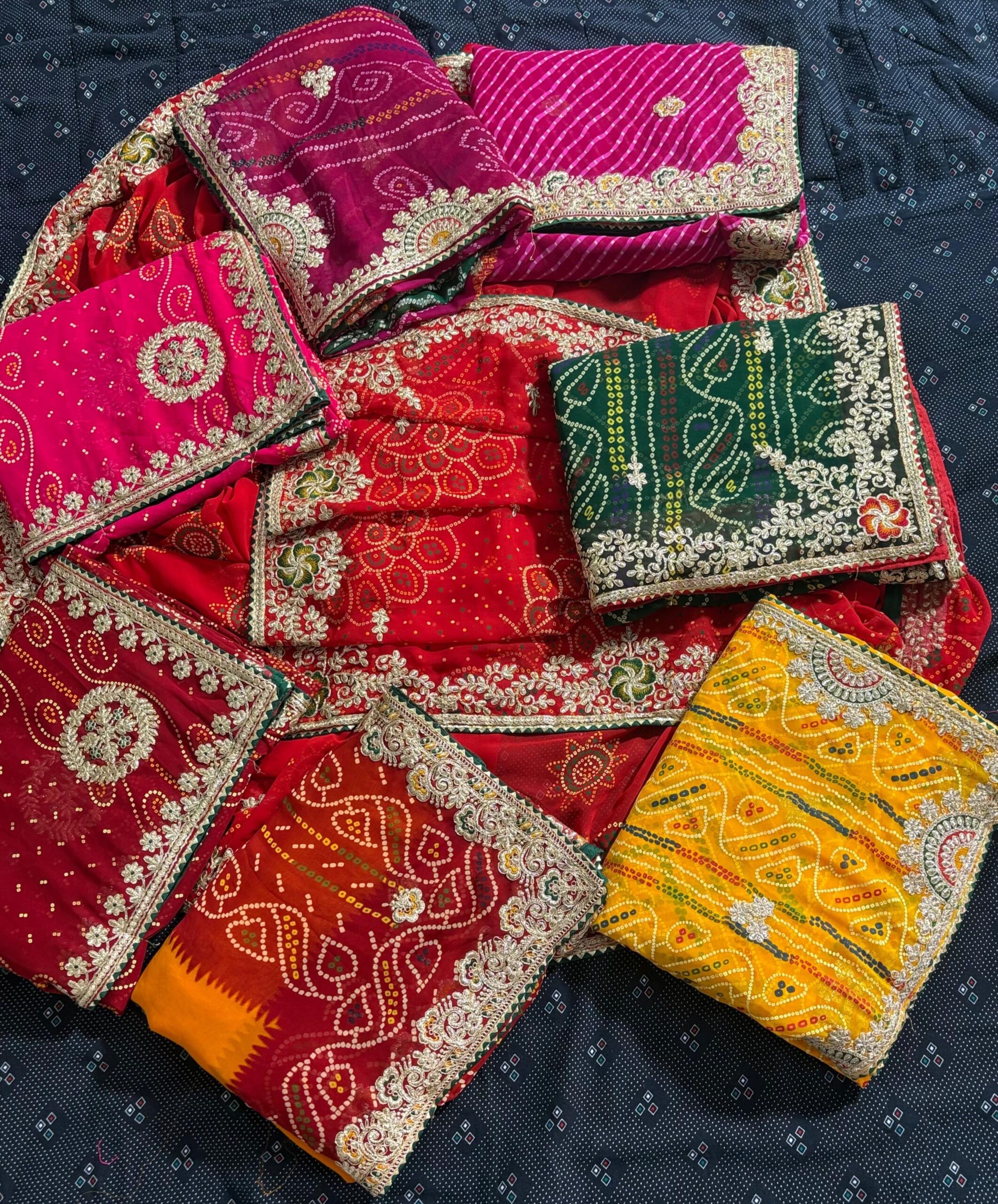 This collection offers multiple unique designs with beautiful colour-matching combinations, making it ideal for weddings, festive occasions, cultural events, and boutique selections. The lightweight georgette fabric ensures a graceful drape, while the handcrafted Gotta Patti detailing adds a touch of royal Marwadi charm.
